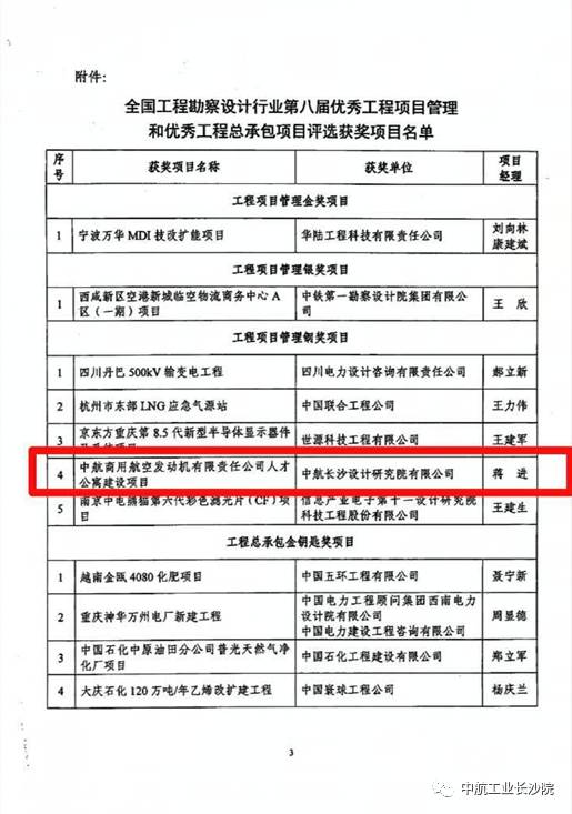 3月20日,從中國勘察設計協會傳來喜訊,長沙院中航商用航空發動機有限責任公司人才公寓建設項目獲得全國工程勘察設計行業第八屆工程項目管理銅獎項目。